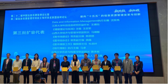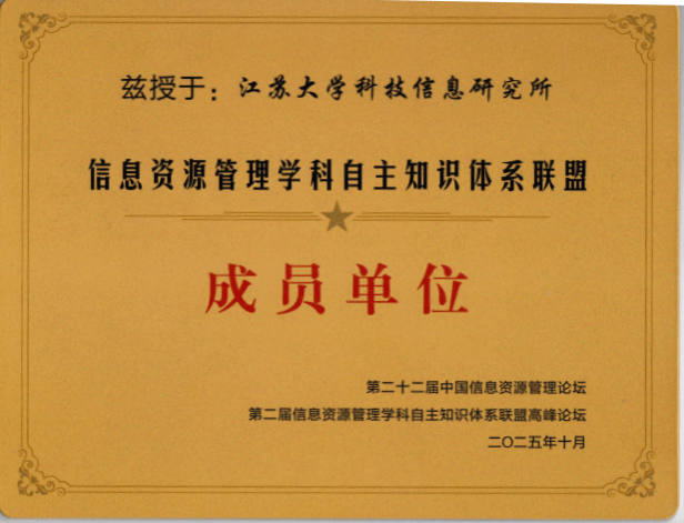 江苏大学科技信息研究所获授“信息资源管理学科自主知识体系联盟成员单位”标牌,刘竟副馆长作为代表领取标牌。