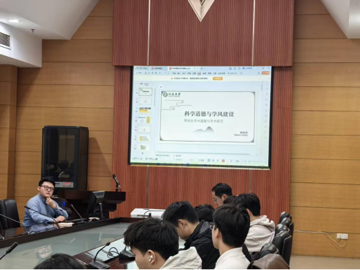 2025年11月25日,2025年秋学期全日制研究生科学道德与学术规范宣讲教育会在图书馆六楼会议室举办,韩牧哲老师担任主讲人,团总支副书记徐振宇担任本次讲座的主持人,全体全日制研究生参加此次讲座。