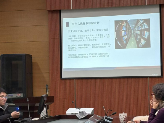 在介绍具体工作内容与流程时,包翔博士详细讲解了辅助查新员所需具备的各项能力门槛及培养路径,并就同学们关心的兼职时间安排、激励政策及待遇问题进行了透明、客观的说明。他强调,查新工作虽然有一定门槛,但图书馆将提供完善的指导与培训机制,帮助同学们快速上手。