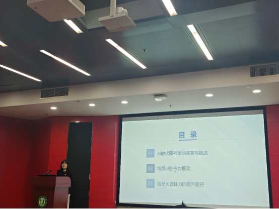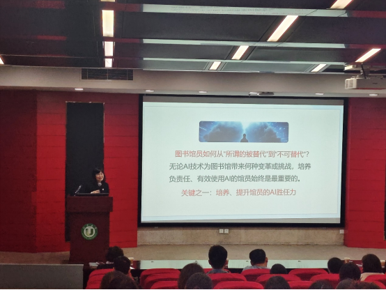 为顺应人工智能时代图书馆行业转型发展趋势,提升图书馆员 AI 核心素养与职业胜任力,搭建人工智能与图书馆服务融合发展的学术交流平台,2026年3月30日上午,中山大学信息管理学院副院长、博士生导师唐琼教授应邀来馆开展图书馆员 AI 胜任力专题学术报告,分享其在该领域的前沿研究成果与实践思考。