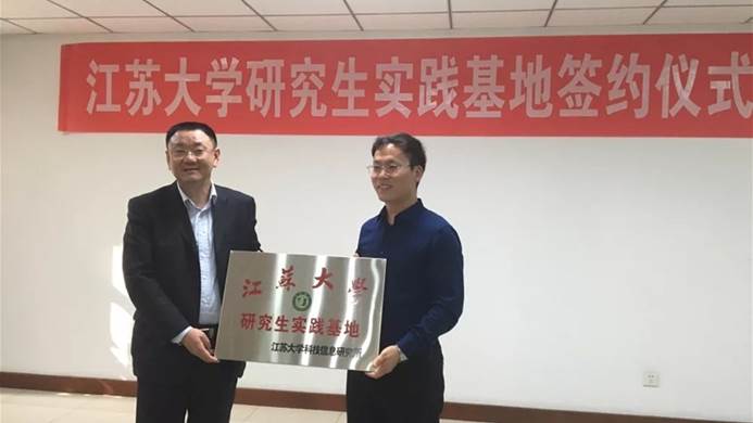 随后,恒维智公司副总经理金志成就公司发展现状做详细介绍,双方进一步就合作事宜开展磋商与探讨。最后,袁润书记给赵旭总经理颁发研究生实践基地指导教师聘书,共同签订“江苏大学研究生实践基地”协议书,并为“江苏大学研究生实践基地”挂牌。仪式结束后,一行人参观了恒维智信息技术有限公司及实践基地并合影留念。