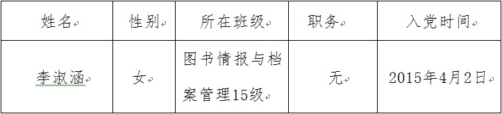 经党支部考察和研究,并请示图书馆党总支同意,拟于近期召开党员大会,讨论 李淑涵 等 1 位同志转为中共正式党员问题,现将 李淑涵 等 1 位同志基本情况公示如下,敬请党员、群众监督,如有意见和建议,请于 5 月 4 日前向所在党支部、图书馆党总支或党委组织部反映。