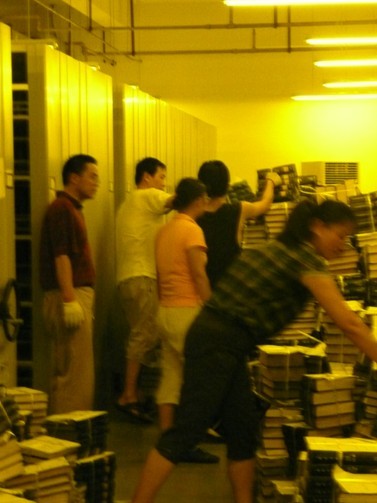 处于新馆地下1层的密集书刊库的整理就是当前的一块“硬骨头”。这里无空调,只能靠鼓风机稍稍降温,条件十分艰苦。加之场地小,书刊周转空间狭小,书刊上架必须先摇开封闭式书刊架,增加了上架的难度;昏暗的紫外线灯光,使整理者视力模糊、异常吃力。在这里参与整理工作的约有40人,大家不论身份,不分你我,默默地坚守岗位,辛勤劳作,为全面实现图书馆搬迁工作目标作出自己的贡献。该库整理工作预计10天左右完成。